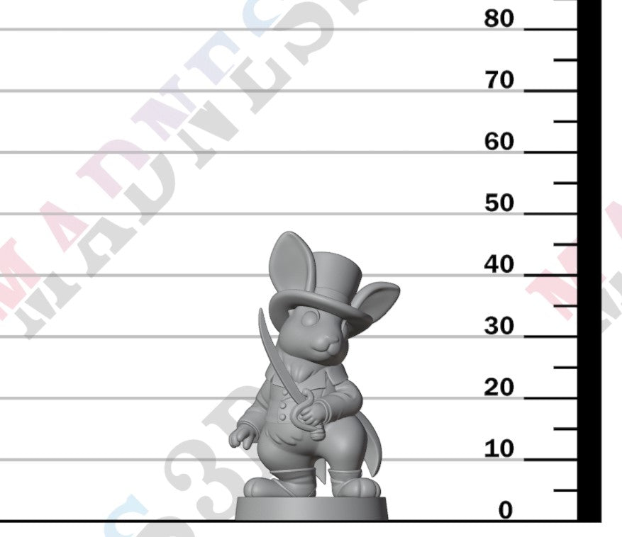 Unpainted resin 3d printed miniature Dandy Rabbit Swordsman by Found Family Adventurecraft.
