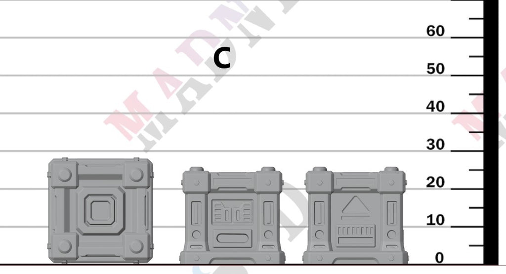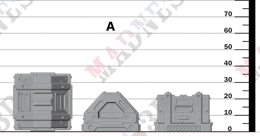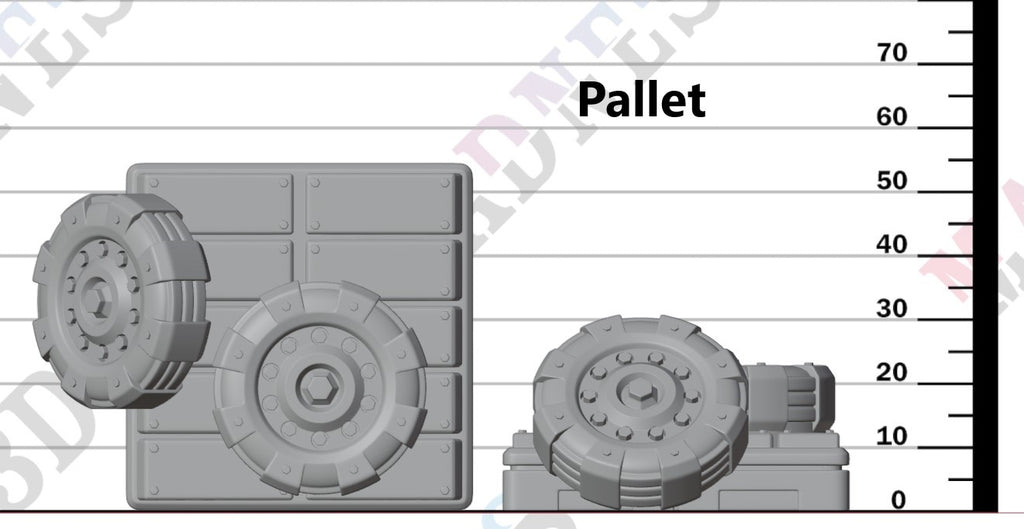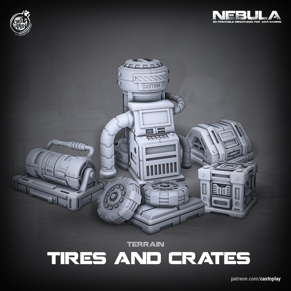 Unpainted resin 3d printed miniature Tires and Crates by Cast n Play.